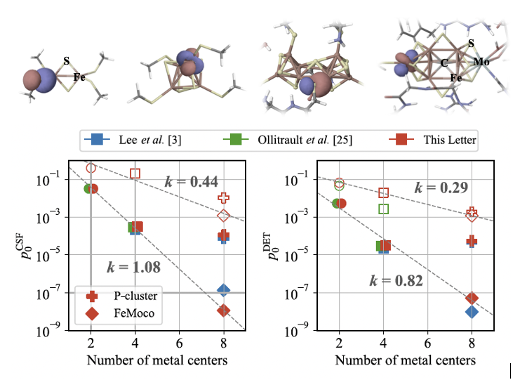 强关联分子体系(如固氮酶铁硫[nFe-mS]团簇)中存在大量d/f电子,其价态、自旋以及分子构型的变化具有很强的多样性,在催化反应(如生物固氮)中起着无可替代的作用。其中,固氮酶铁硫团簇目前是被认为是经典计算化学能够在高精度波函数级别计算模拟的极限,是量子计算未来可能发挥优势的实际重要体系之一。